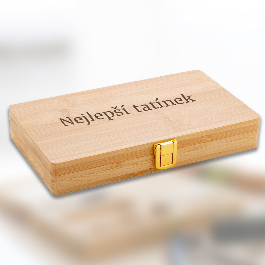 Praktická 21 dílná sada nářadí v bambusové krabičce. Na víko vygravírujeme vaše věnování – třeba pro dědečka, tatínka, bratra nebo do chalupy.