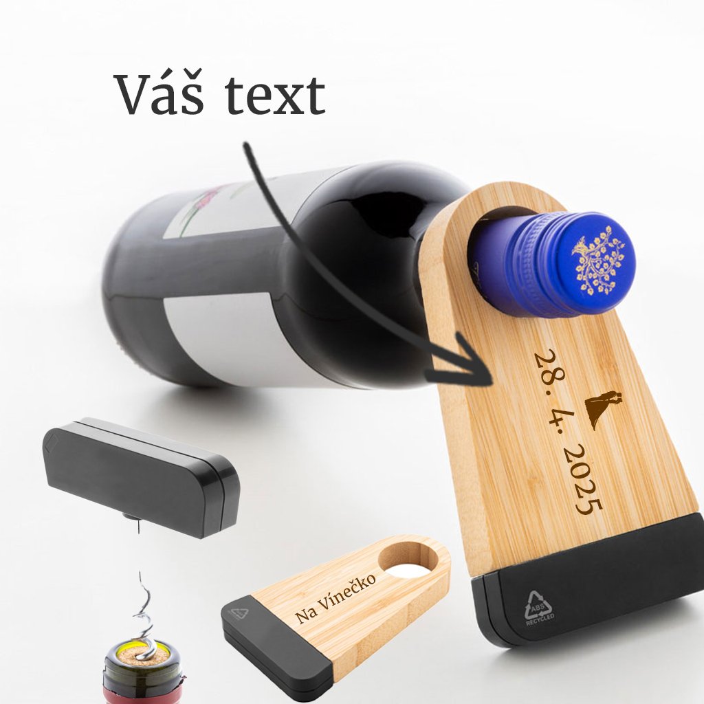 Elegantní vývrtka z bambusu a nerezu s praktickým držákem na láhev. Nechte si vygravírovat věnování k výročí, svatbě nebo jen tak pro radost.