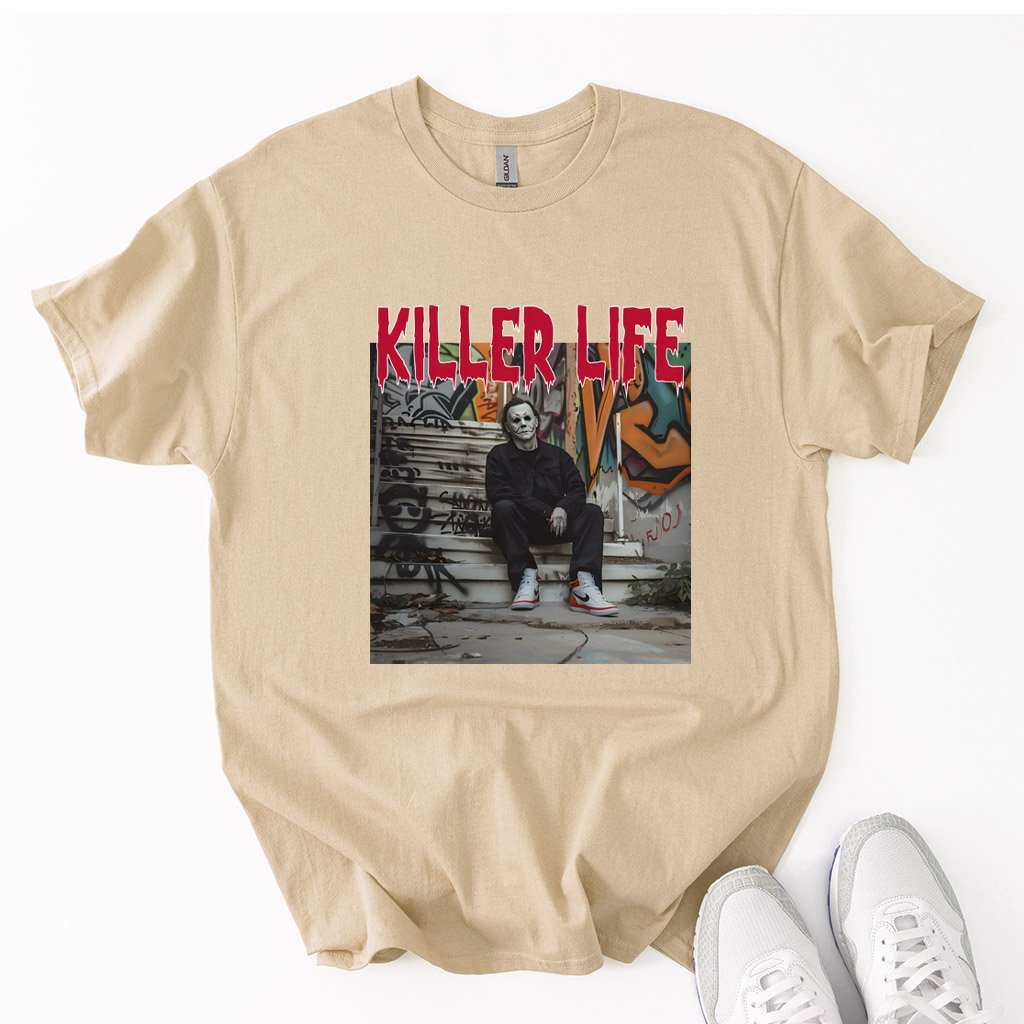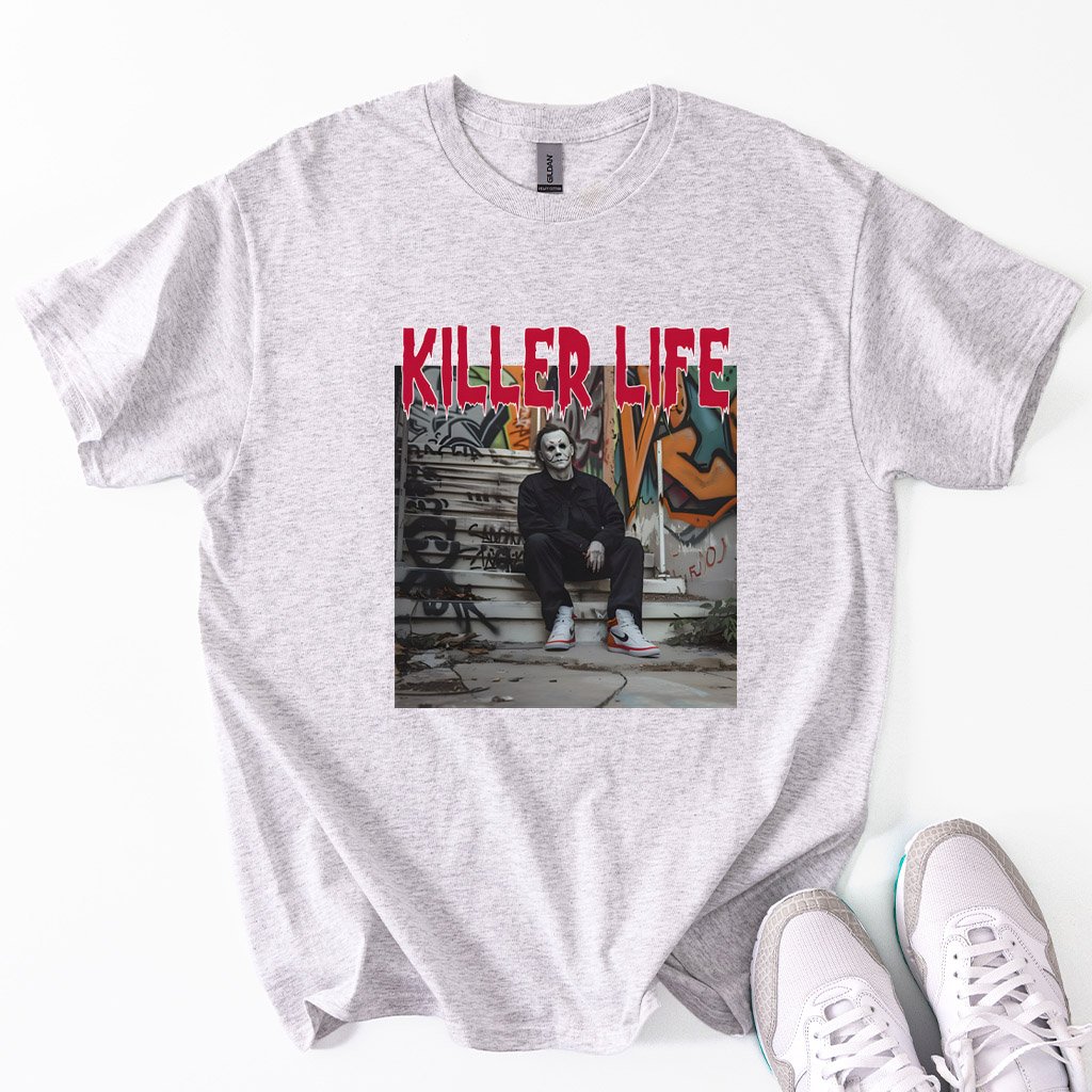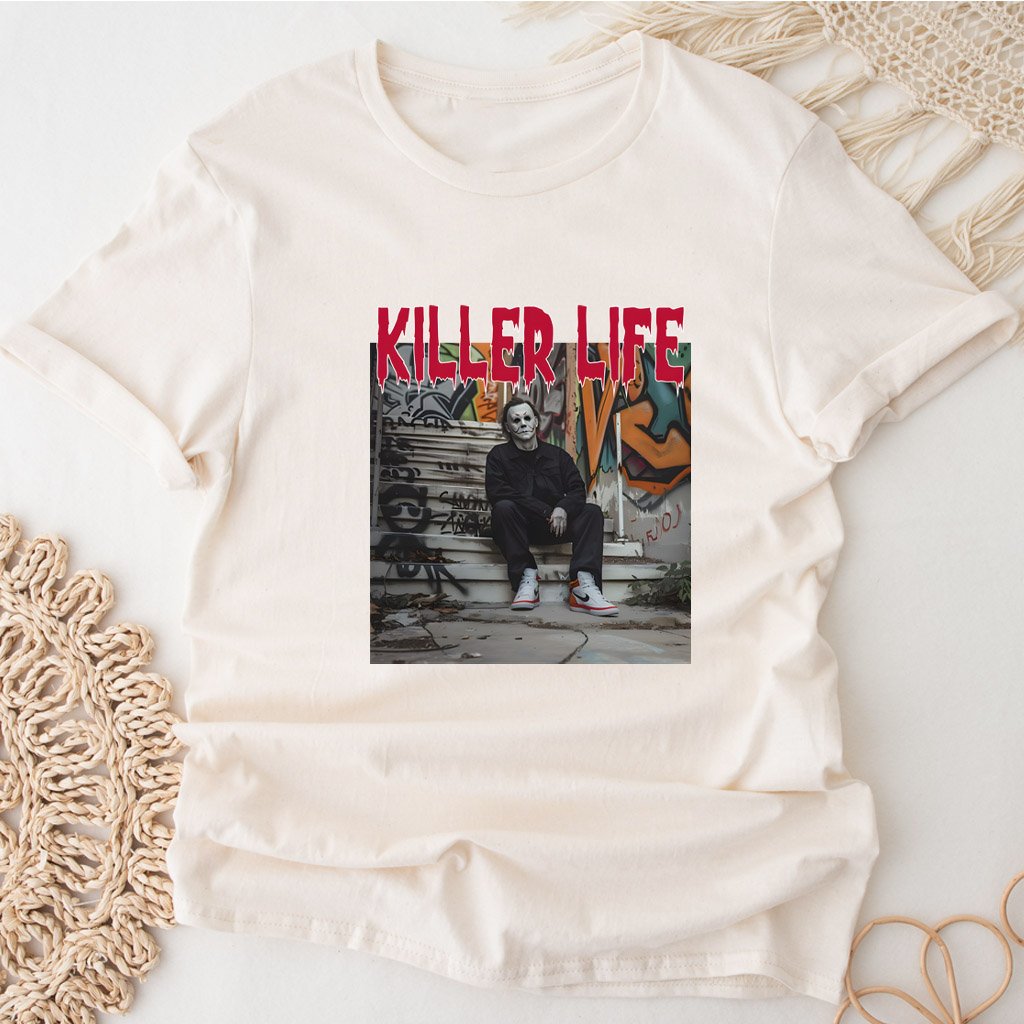 Tričko s Michaelem Myersem v urban stylu a nápisem „Killer Life“. Spojení hororové klasiky a streetwearu pro fanoušky originálních motivů.