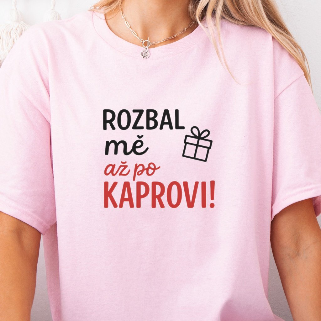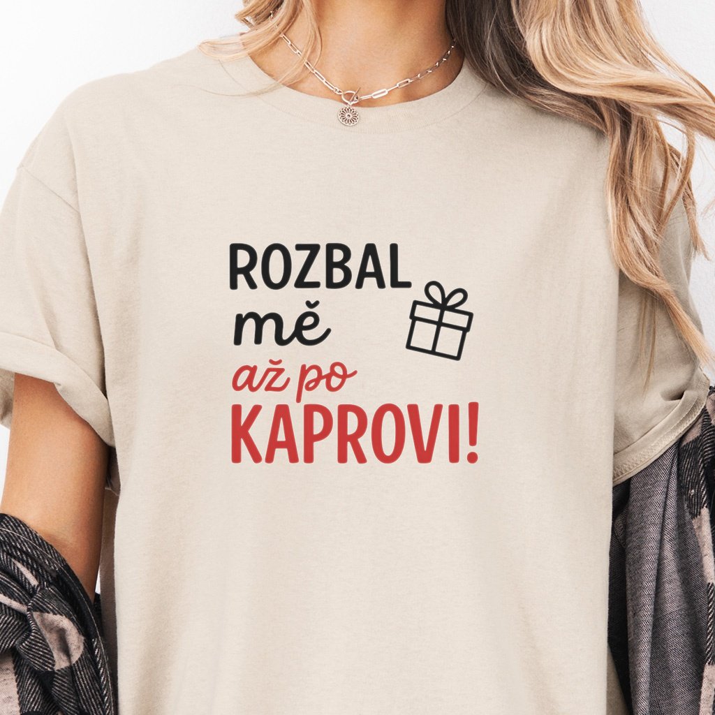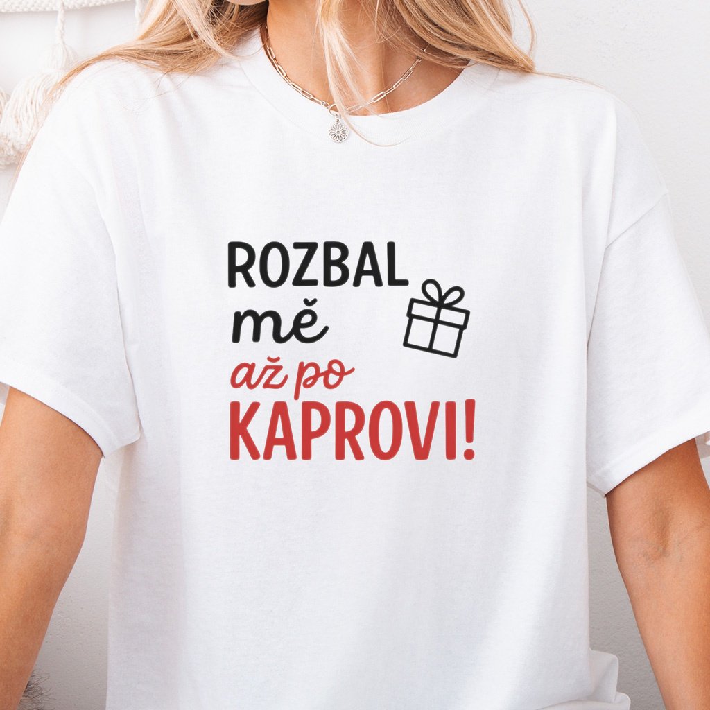 Tohle vtipné vánoční tričko s nápisem „Rozbal mě až po kaprovi!“ zaručeně pobaví u štědrovečerního stolu i na vánočním večírku.