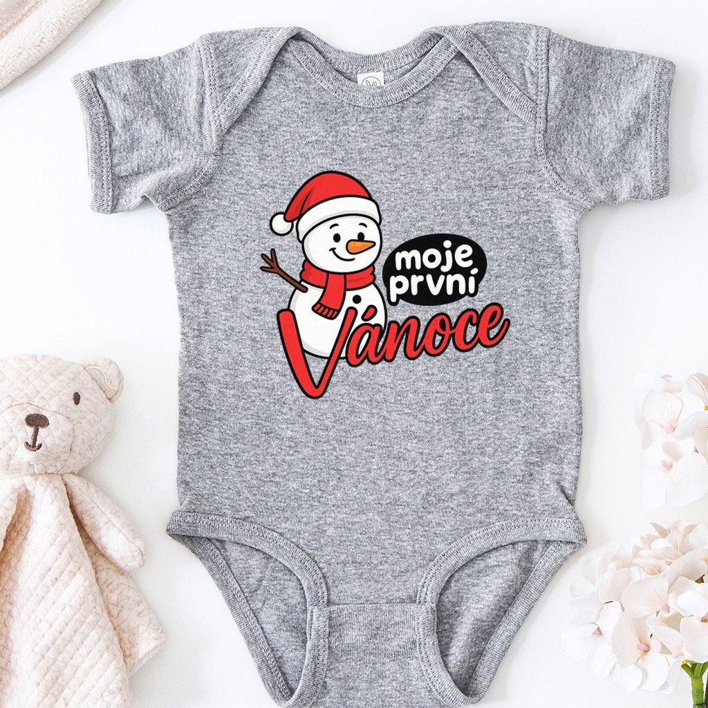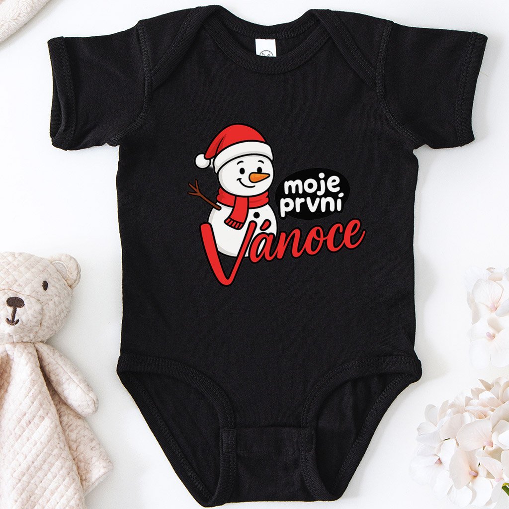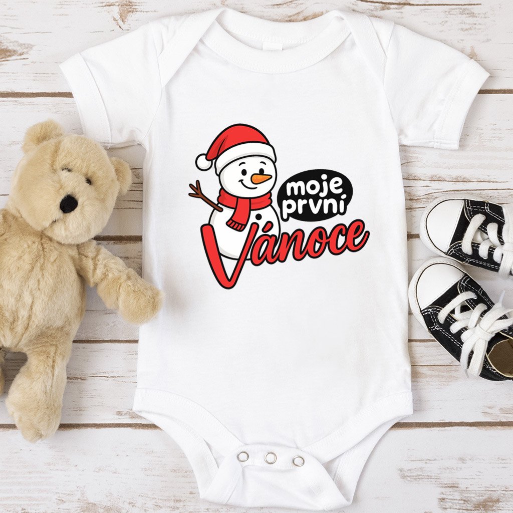 Roztomilé dětské body s vánočním motivem sněhuláka a nápisem „Moje první Vánoce“. Ideální dárek pro nejmenší na jejich první svátky.