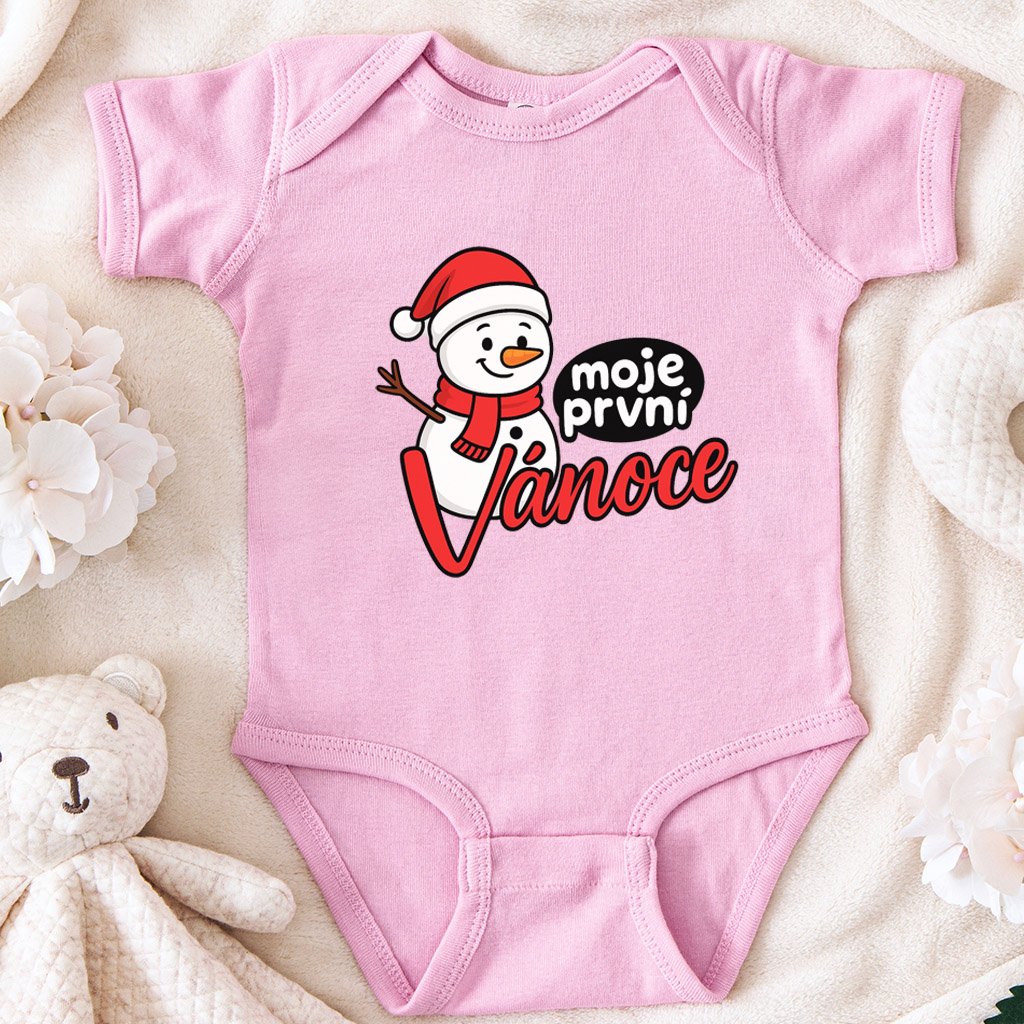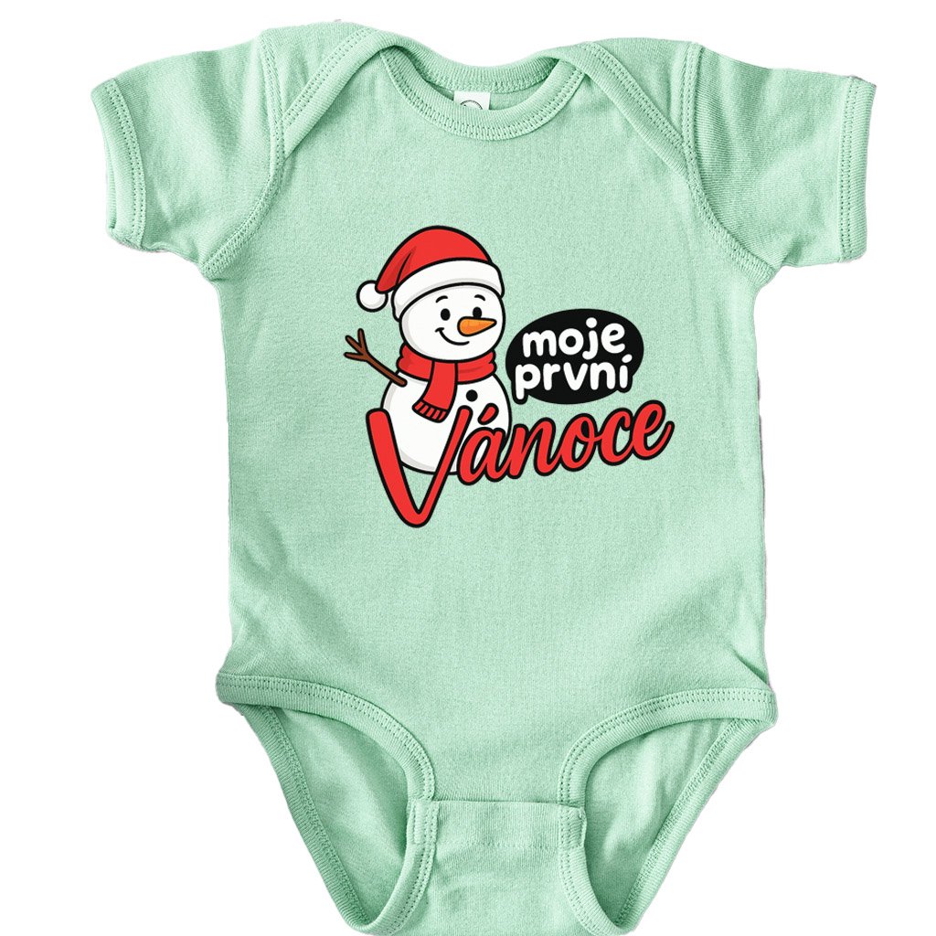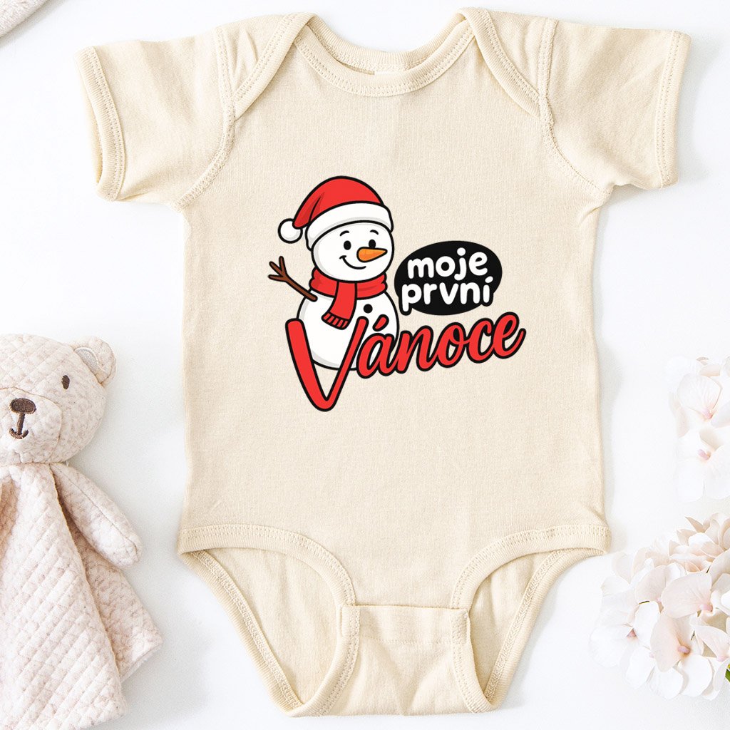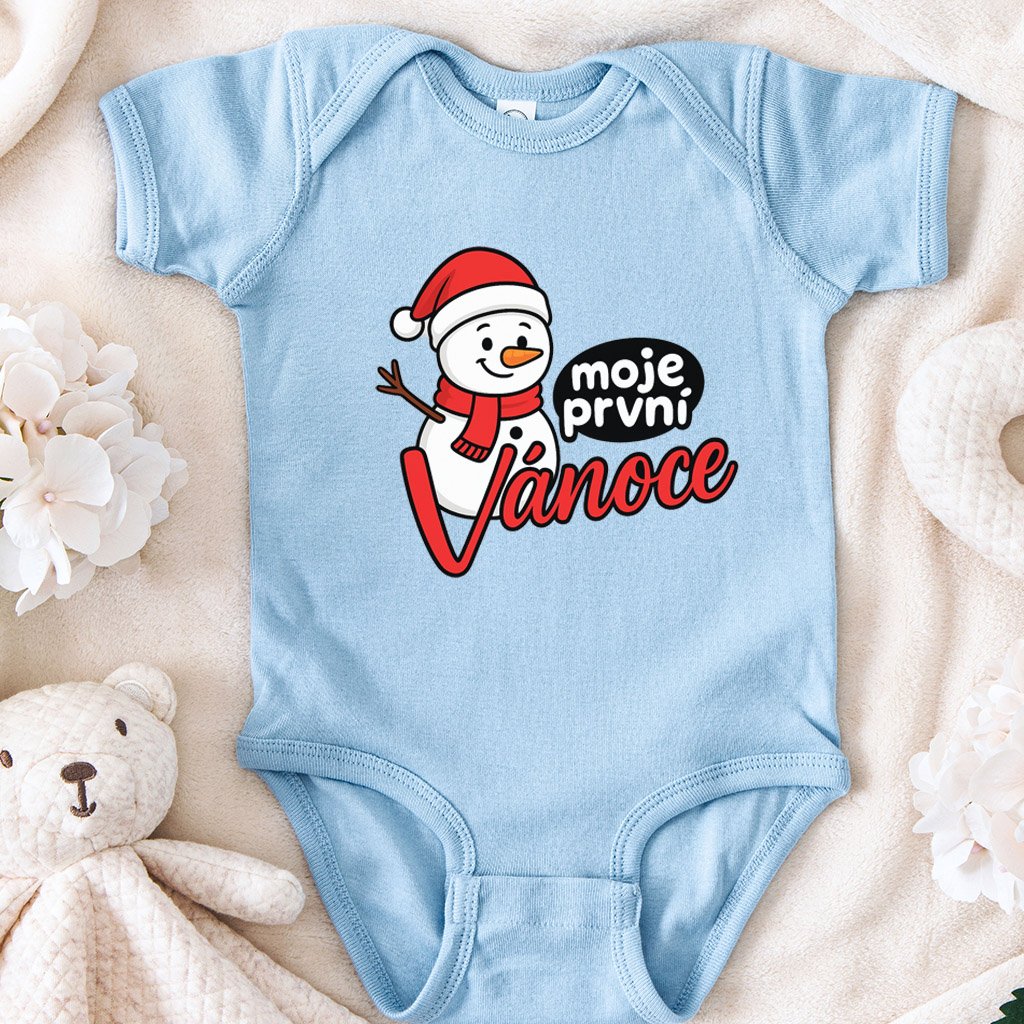Roztomilé dětské body s vánočním motivem sněhuláka a nápisem „Moje první Vánoce“. Ideální dárek pro nejmenší na jejich první svátky.