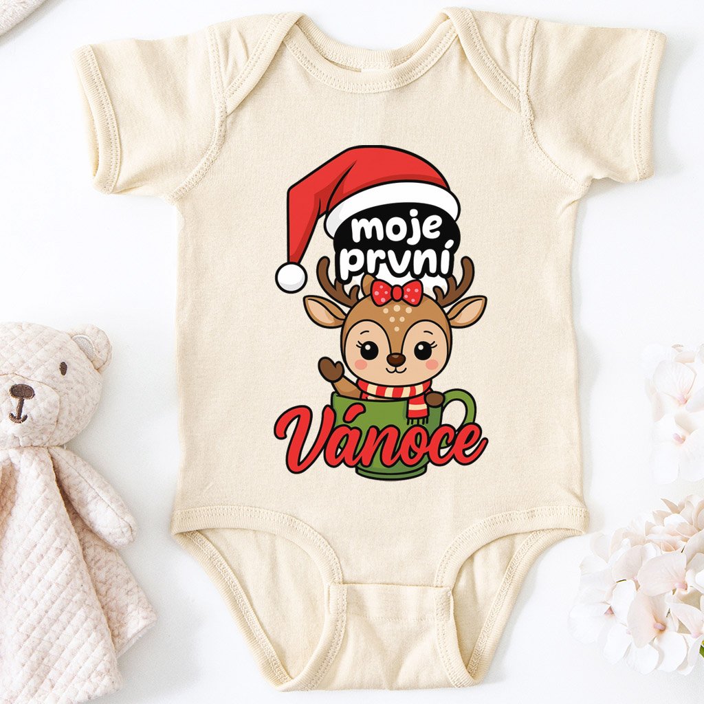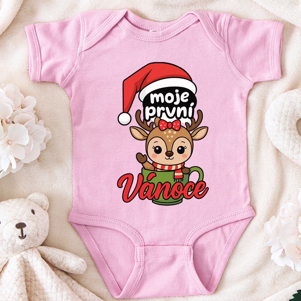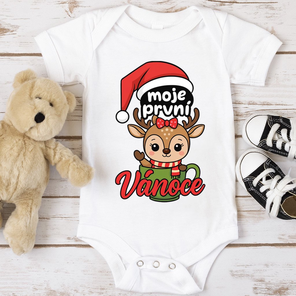 Kouzelně roztomilé dětské body s motivem sobí holčičky v hrnečku a nápisem Moje první Vánoce – ideální pro první sváteční fotografie. 🎅🦌
