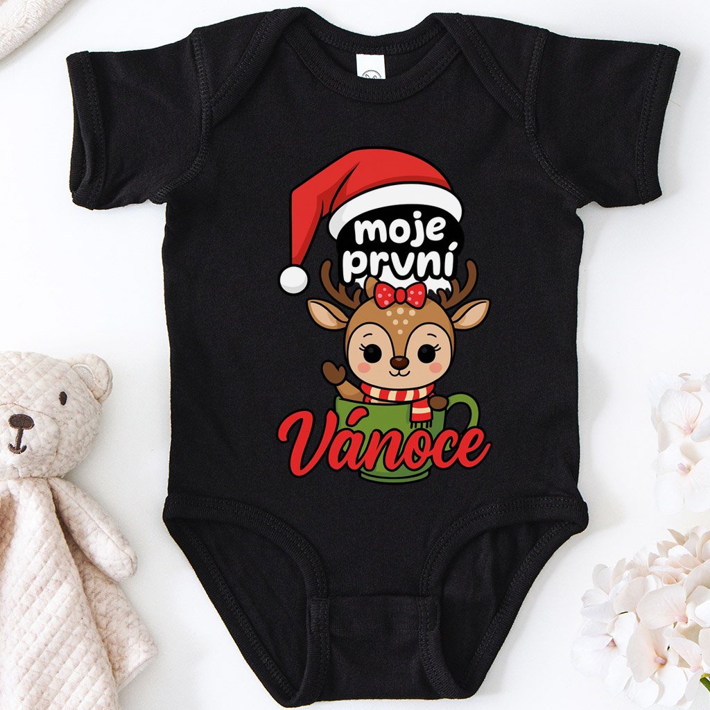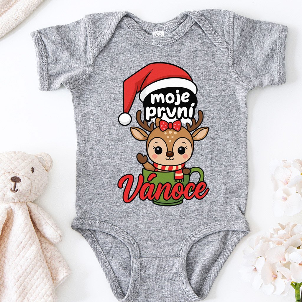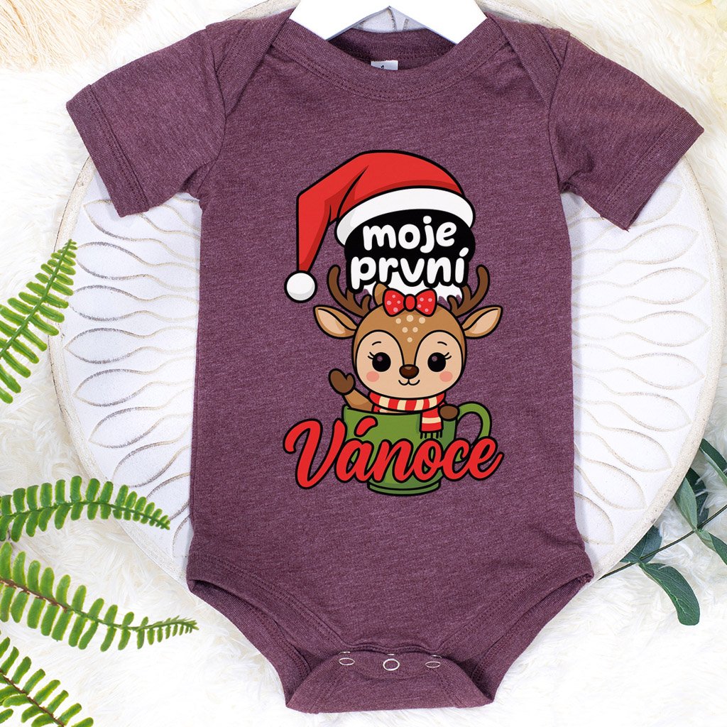 Kouzelně roztomilé dětské body s motivem sobí holčičky v hrnečku a nápisem Moje první Vánoce – ideální pro první sváteční fotografie. 🎅🦌