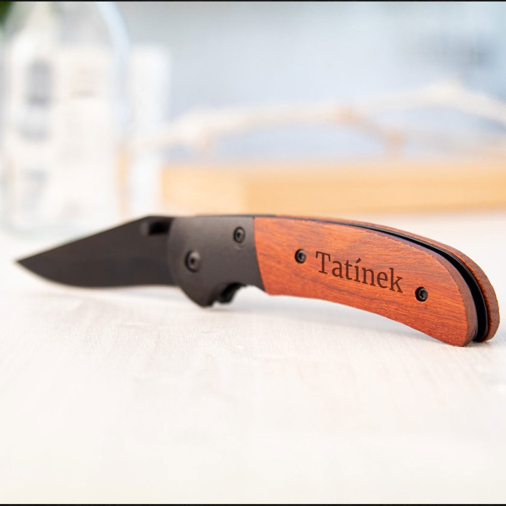 Praktický skládací nůž z nerezové oceli s dřevěnou rukojetí a pojistkou. Na rukojeť vyryjeme jméno nebo vzkaz – ideální dárek pro dědečka, tatínka, bratra i do přírody. Outdoor style.