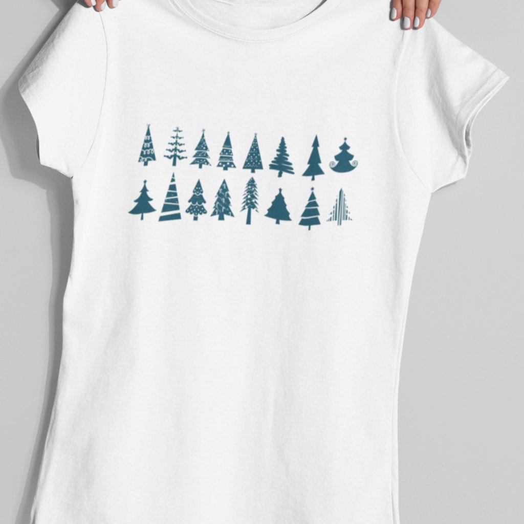 Minimalistické tričko s motivem vánočních stromků – ideální pro ty, kteří mají rádi svátky s vkusem a stylem.