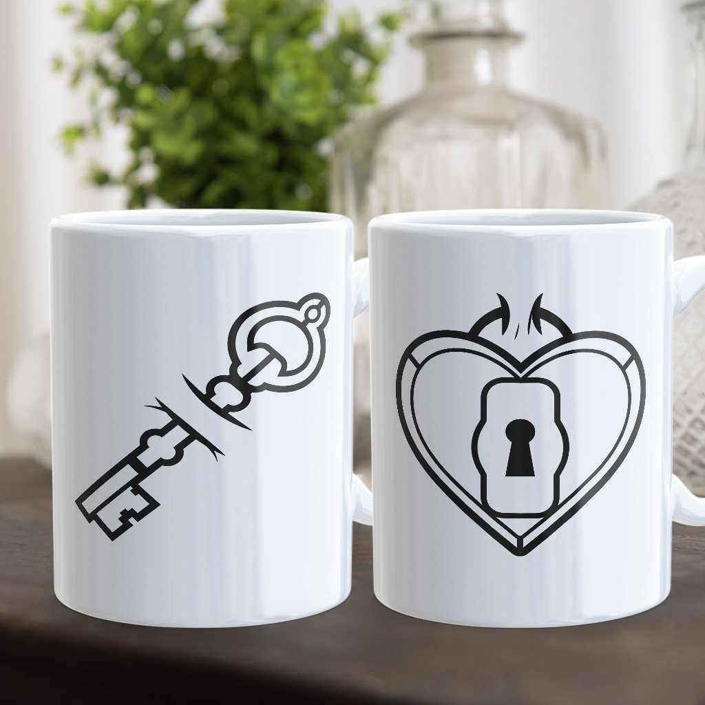 2 kusy párových hrnečků z edice pro páry s potiskem „Key & Heart“.
