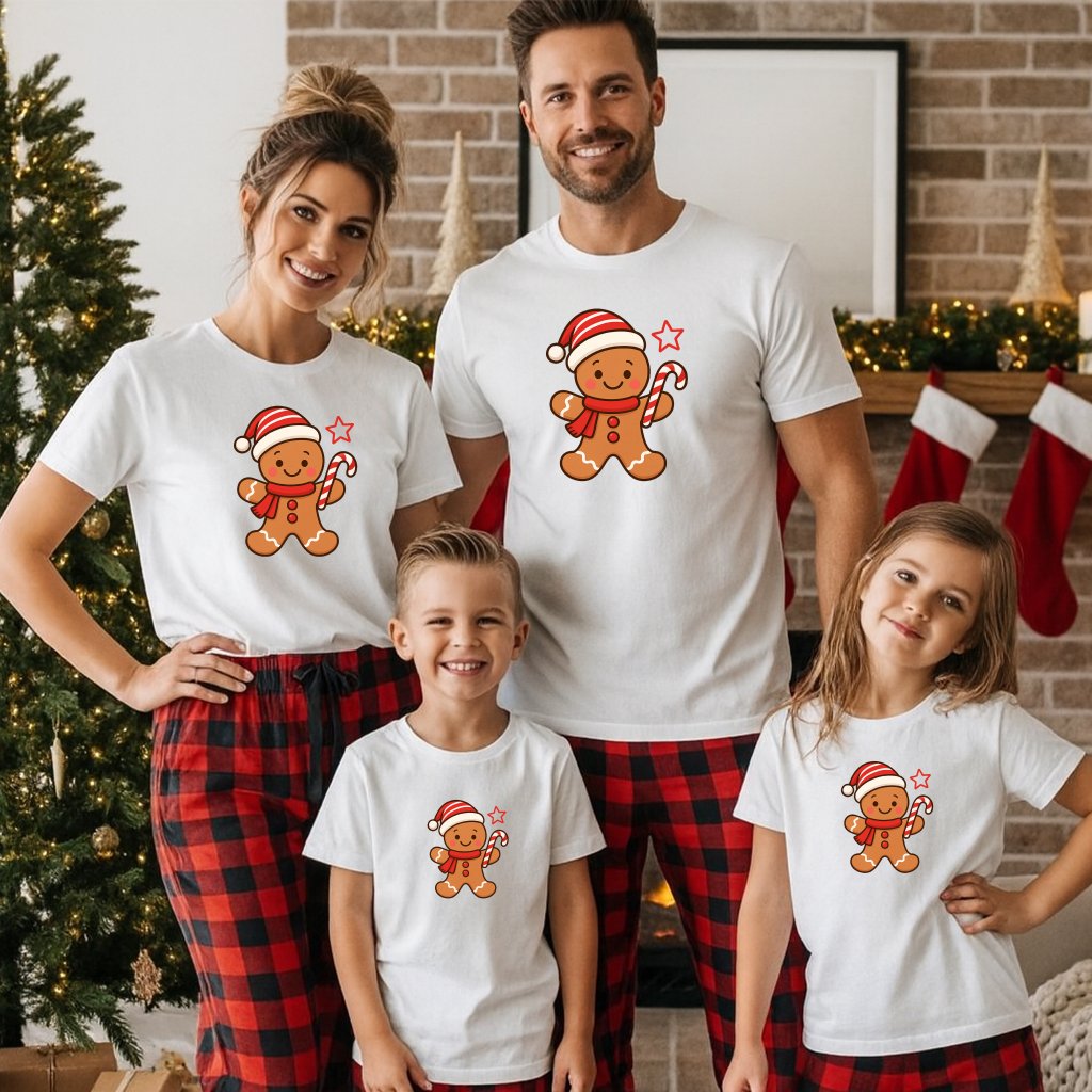 Udělejte si Vánoce ještě kouzelnější s těmito rodinnými tričky s motivem veselého perníčka v Santa čepici a s cukrovou hůlkou. Trička jsou dokonale sladěná pro celou rodinu – maminku, tatínka i děti – a skvěle se hodí pro vánoční focení, rodinné návštěvy nebo jen domácí lenošení u pohádek.