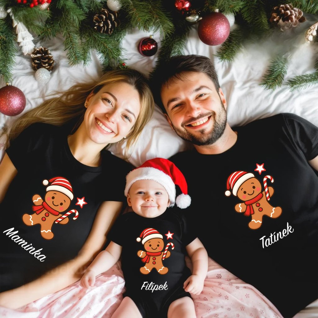 Ladící rodinná trička s roztomilým perníčkem ve vánoční čepici – skvělá volba na společné focení, domácí pohodu i jako milý vánoční dárek.